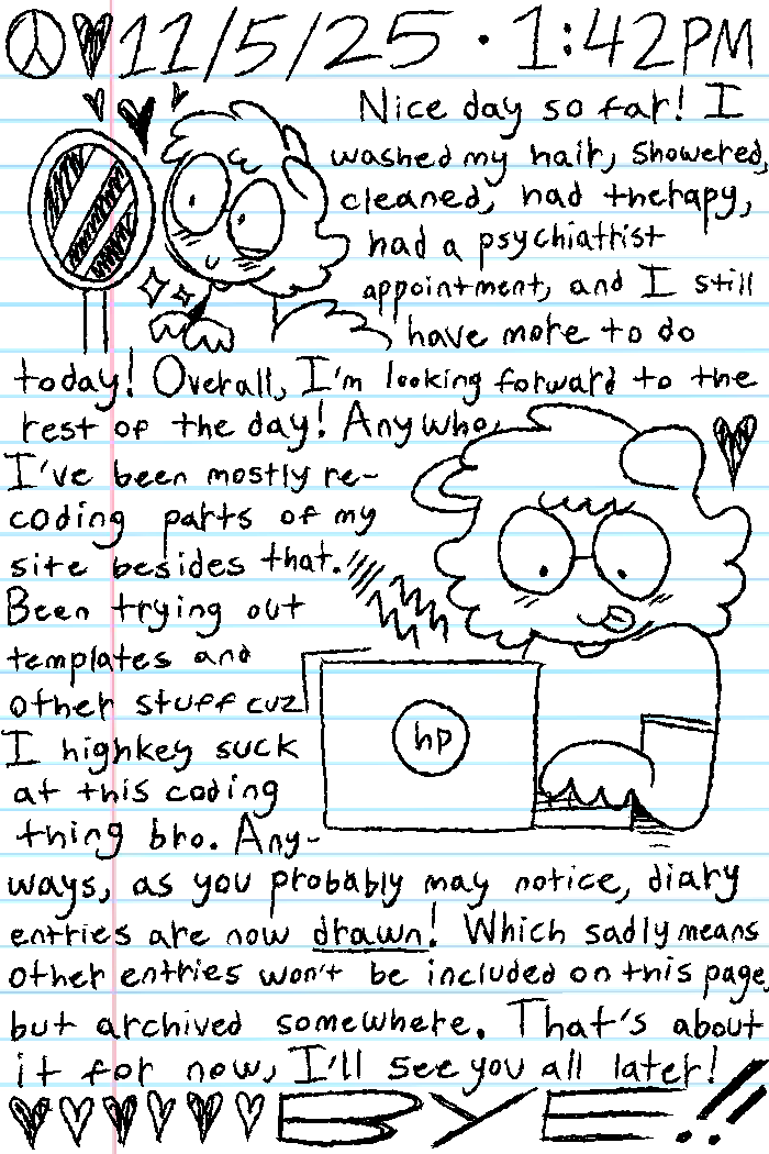 Nice day so far! I washed my hair, cleaned, had therapy, had a psychiatrist appointment, and I still have more to do today! Overall, I'm looking forward to the rest of the day! Anywho, I've been mostly recoding parts of my sites besides that. Been trying out templates and other stuff because I highkey suck at this coding thing bro. Anyways, as you probably may notice, diary entries are now drawn! Which sadly means other entries won't be included on this page, but archived somewhere. That's about it for now, I'll see you all later! BYE!!