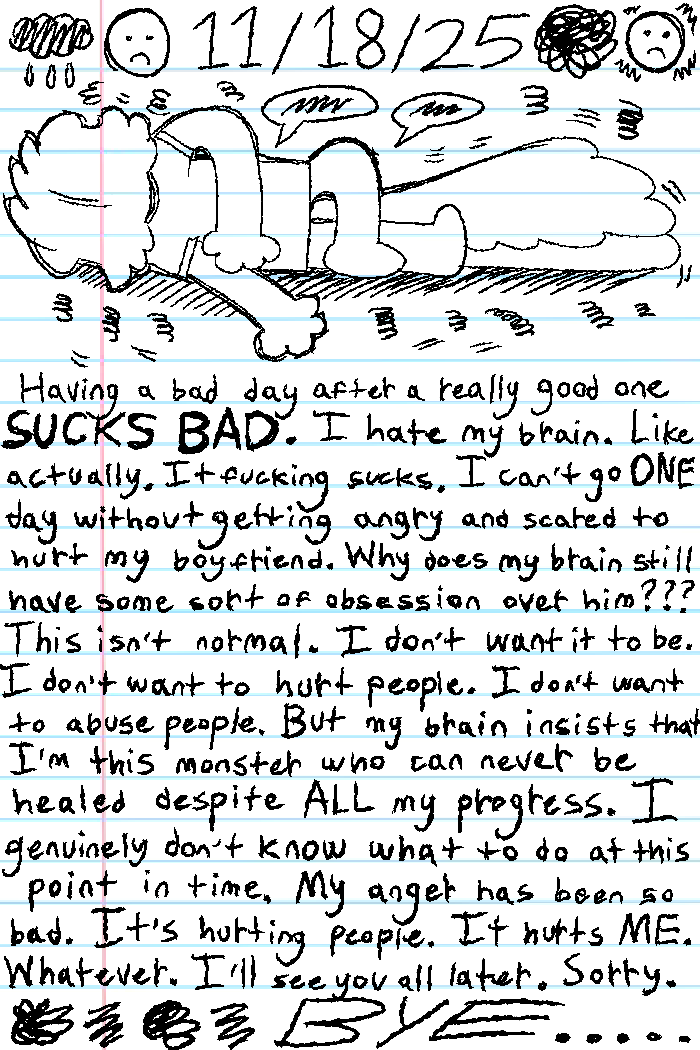 Having a bad day after a really good one SUCKS BAD. I hate my brain. Like actually. It fucking sucks. I can't go ONE DAY without getting angry and scared to hurt my boyfriend. Why does my brain still have some sort of obsession over him??? This isn't normal. I don't want it to be. But my brain insists that I'm this monster who can never be healed despite ALL my progress. I genuinely don't know what to do at this point in time. My anger has been so bad. It's hurting people. It hurts ME. Whatever. I'll see you all later. Sorry. BYE.....